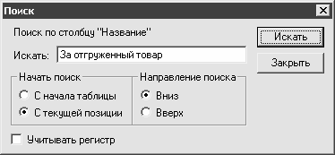 Чтобы при поиске учитывался регистр символов (прописные либо строчные), установите флажок Учитывать регистр. В данном случае, например, если в поле Искать введено значение За отгруженный товар, то название за отГружеННый тОваР будет при поиске проигнорировано.