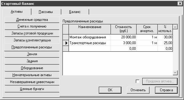 Вы можете отразить операцию продажи зданий, которые были приобретены до начала проекта (данную операцию можно отразить по каждой позиции списка в отдельности). Это осуществляется точно так же, как и для предоплаченных расходов (см. рис. 4.23).