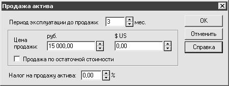 Вы можете отразить операцию продажи актива, который был приобретен до начала проекта (данную операцию можно отразить по каждой позиции списка в отдельности). Для этого в нижней части вкладки Предоплаченные расходы нужно установить флажок, после чего станет доступной кнопка Продажа актива. При нажатии данной кнопки на экране открывается окно, которое показано на рис. 4.23.