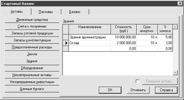 Общая стоимость зданий, перечисленных на данной вкладке, рассчитывается программой автоматически и отображается в балансе в строке Здания за вычетом общей суммы износа на начало проекта.