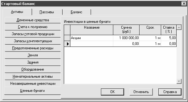 Если на дату начала проекта предприятие располагает какими-либо ценными бумагами (акциями, облигациями, и т.п.), то информацию о них необходимо веси на вкладке Ценные бумаги, содержимое которой показано на рис. 4.26.