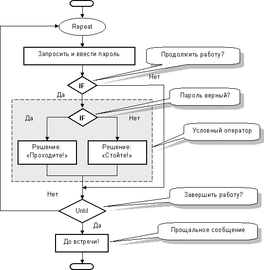 Программа работает? Прекрасно! Но одна шероховатость меня удручает. Покидая пост, часовой почему-то поднимает лишний шум: «Стойте!» – кричит он. Кому он это кричит? своему командиру? Безобразие! Пусть при оставлении поста часовой не проверяет пароль. С этой целью добавим ещё один условный оператор, как показано на рис. 29.