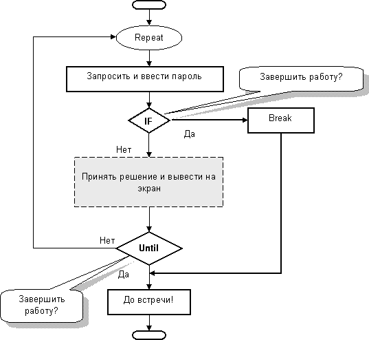 Посмотрите, как изменится блок-схема с оператором BREAK (рис. 30), здесь оператор принятия решения я заменил пунктирным прямоугольником.