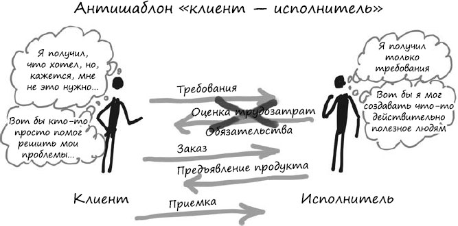 Но в антишаблоне «клиент – исполнитель» обсуждение проблем и решений заменено дискуссиями и соглашениями относительно требований. Проигрывают в такой ситуации все.