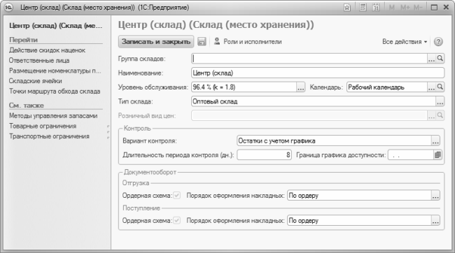 В настройках склада можно указать рабочие дни, по которым на данном складе товар является доступным. Это определяется с помощью параметра Календарь: в нем из списка календарей, который формируется в соответствующем справочнике (мы познакомимся с ним позже), выбирается требуемый календарь. Таким образом, программа не позволит произвести отпуск товара в те дни, по которым он не доступен на данном складе (попросту говоря, вы не сможете провести соответствующий товарно-сопроводительный документ).
