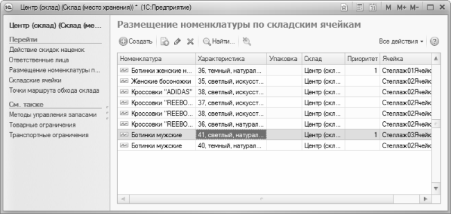 Рис. 5.32. Настройка размещения номенклатуры по складским ячейкам