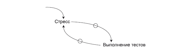 На рис. 25.1 представлена диаграмма взаимовлияния между стрессом и тестированием (она напоминает диаграммы Герри Вейнберга (Gerry Weinberg) в его книге Quality Software Management). Стрелка между узлами диаграммы означает, что увеличение первого показателя влечет за собой увеличение второго показателя. Стрелка с кружком означает, что увеличение первого показателя влечет за собой уменьшение второго показателя.