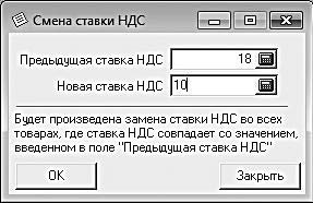Для замены ставки НДС следует выполнить команду главного меню Сервис ? Дополнительно ? Смена ставки НДС. При активизации данной команды на экране открывается окно, изображенное на рис. 4.6.