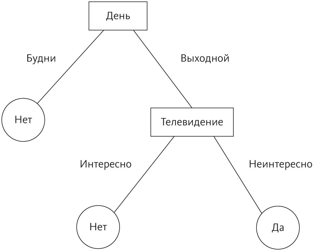 Другое ограничение обратной дедукции заключается в том, что оно требует большого объема вычислений и из-за этого его трудно применять к масштабным наборам данных. Для решения этой проблемы символисты прибегают к индукции с помощью дерева решений. Деревья решений можно считать ответом на вопрос, что делать, если к какому-то частному случаю применимы правила не одного, а целого ряда понятий. Как в таком случае решить, к какому понятию принадлежит этот случай? Если перед нами частично скрытый предмет с плоской поверхностью и четырьмя ножками, как понять, стол это или стул? Один из вариантов — упорядочить правила, например, в порядке уменьшения точности и выбрать первое подходящее. Другой — дать правилам проголосовать. Деревья решений же априори гарантируют, что к каждому случаю будет подобрано ровно одно правило. Это будет так, если каждая пара правил отличается как минимум в одном тестировании атрибутов и такой набор правил можно выстроить в виде дерева решений. Например, посмотрите на следующий набор: