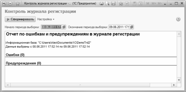 Также вы можете в любой момент сформировать отчет вручную. Для этого нужно в окне контроля журнала регистрации (см. рис. 4.6) указать начальную и конечную даты интервала времени, данные которого должны быть включены в отчет, и нажать кнопку Сформировать.