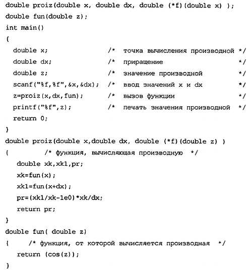 Рассмотрим пример использования указателя на функцию в качестве параметра функции, вычисляющей производную от cos(x).