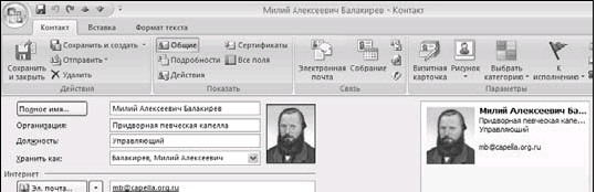Создавая электронный контакт, во-первых, внесите на вкладке «Контакт» (в Outlook 2003 – на вкладке «Общие») все «формальные» контактные данные – полное имя вашего знакомого, название организации, должность, телефоны, e-mail и т.д. Если есть возможность – добавьте фотографию. (см. раздел «Примеры».)
