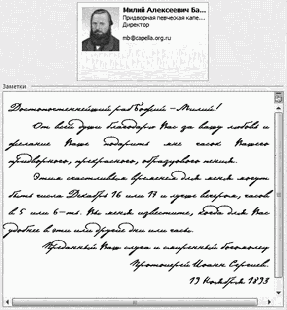 Например, в контакте композитора Милия Балакирева, бывшего управляющим Придворной певческой капеллой, в адресной книге о. Иоанна Кронштадтского в поле заметок можно было бы скопировать из раздела «Почта» следующее письмо (цитируем подлинный текст):