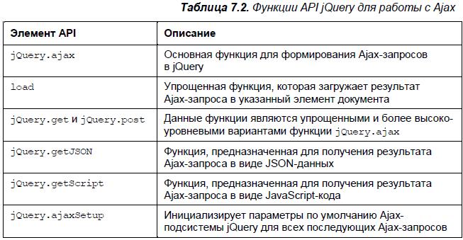 Здесь мы рассмотрим все функции и события Ajax, имеющиеся в библиотеке и составляющие API jQuery по работе с асинхронными запросами. В табл. 7.2 приведен список функций Ajax-подсистемы в jQuery.