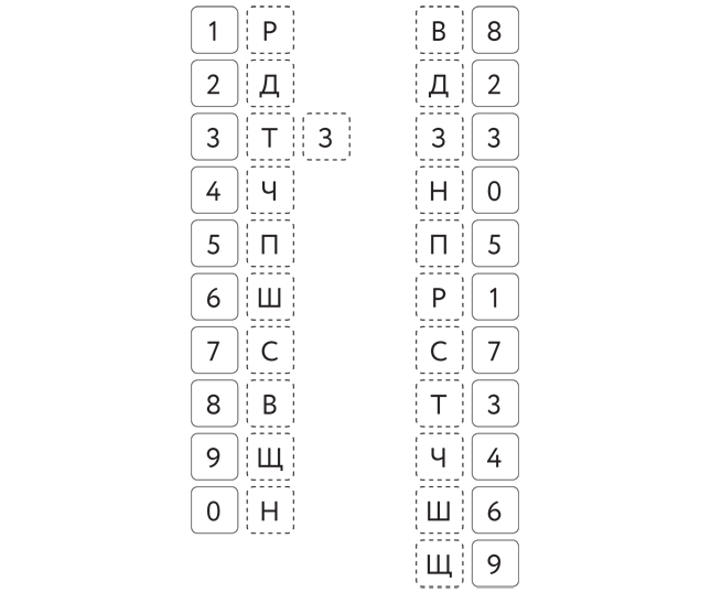 Все верно! «Я помню чудное мгновенье…» – правильный ответ. Теперь, если оставить в этой строчке только согласные, а затем, используя рисунок с предыдущего разворота, заменить согласные на цифры, то, последовательно выписывая их, получим наш код-пароль 50420080.