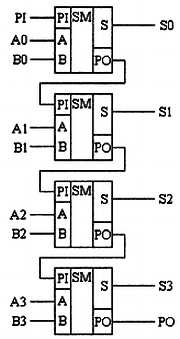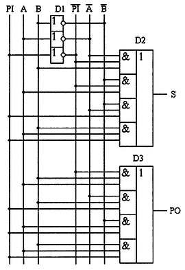 В обозначении входов и выходов полного сумматора использовано следующее правило: в качестве входов использованы одноразрядные двоичные числа А и В; сумма — это одноразрядное двоичное число S; перенос обозначен буквой Р; для обозначения входа переноса используется сочетание букв PI (I — сокращение от английского слова input, вход); для обозначения выхода переноса используется сочетание букв РО (О — сокращение от английского слова output, выход).