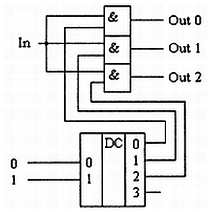 Задача передачи сигнала с одного входа микросхемы на один из нескольких выходов называется демультиплексированием. Демультиплексор можно построить на основе точно таких же схем логического «И», как и при построении мультиплексора. Существенным отличием от мультиплексора является возможность объединения нескольких входов в один без дополнительных элементов. Однако для уменьшения входного тока демультиплексора на входе лучше поставить инвертор.