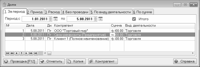 В данном окне представлен список введенных ранее долговых записей. Для каждой позиции списка в соответствующих колонках последовательно отображается порядковый номер записи, дата создания записи, день недели, когда была создана запись, наименование контрагента по задолженности, сумма долга и вид деятельности, к которому следует отнести данную запись.
