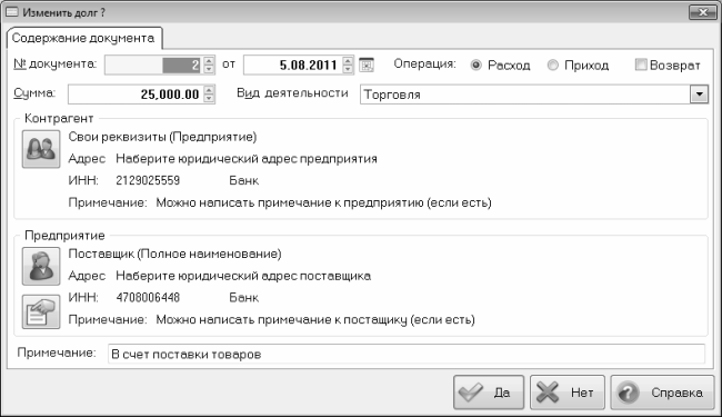 В поле Примечание при необходимости можно с клавиатуры ввести дополнительную информацию произвольного характера о данной долговой записи. Например, можно ввести текст, раскрывающий суть записи: Дано наличными в долг, Отпущен товар с отсрочкой платежа, За аренду склада, и т. п.