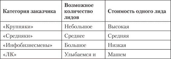 К примеру, представим, что, работая с клиентами категории «средняки», Вы попытаетесь продать им лиды по стоимости «крупняковых».