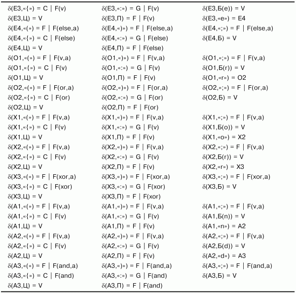 При описании функции переходов через разделитель «|» указаны вызовы функции F, необходимые при выполнении того или иного перехода (если они есть).