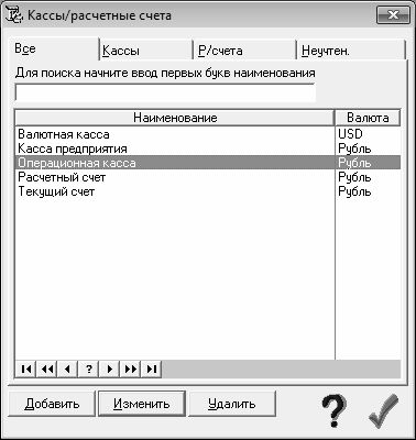 В данном окне на вкладке Все приводится полный список введенных ранее касс и расчетных счетов. Для каждой позиции списка в соответствующих колонках отображается ее название и валюта учета.