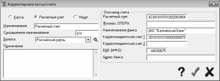 Рис. 1.13. Ввод и редактирование сведений о кассе или банковском счете