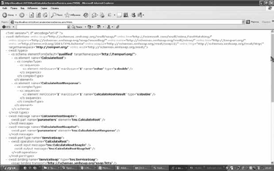 На самом деле, если мы хотим увидеть, как представлен веб-сервис, так сказать, его внутреннее представление, мы можем обратиться к XML-версии и увидеть, что используются стандартный протокол SOAP, язык описания веб-сервисов WSDL и на этом языке (как мы видим, вариант XML версии 1.0) задается описание веб-сервиса. Здесь указывается, где у нас хранится этот веб-сервис, как называется, указано, что есть элемент, который называется CalculateRoot, и какого рода значения он получает на вход: это входной параметр с именем Value и типом Double. Если мы более внимательно просмотрим XML-структуру этого представления, а именно таким образом выглядит веб-сервис в XML-представлении, мы увидим ряд других параметров: параметры, которые он принимает на вход, параметры, которые он возвращает, и то, что взаимодействие осуществляется посредством передачи сообщений на языке WSDL от клиента к серверу и обратно. На самом деле, если посмотреть на скриншот (рис. 11.1), видно, что здесь представлена небольшая часть описания этого веб-сервиса. На самом деле описание даже такого небольшого веб-сервиса на языке XML занимает достаточно много места, поскольку используется большое количество стандартных функций, стандартных методов, которые применяются для. NET веб-сервисов.