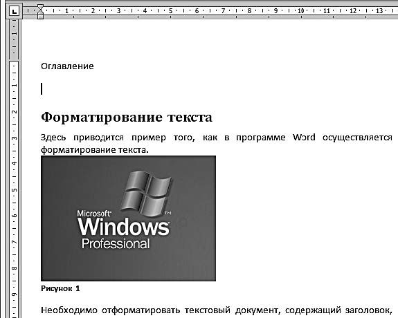 Сформируем оглавление документа, с которым мы работали в предыдущих разделах (см. рис. 2.18). Вначале подготовим место для оглавления: для этого нужно установить курсор перед заголовком и нажать клавишу Enter, после чего к появившемуся пустому абзацу применить стиль Обычный (стиль выбирается в окне выбора стилей, см. рис. 2.9). Набираем слово Оглавление и опять нажимаем Enter; в результате выполненных действий документ должен принять вид, как на рис. 2.19.