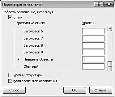 В данном окне нам нужно выбрать стили, которые будут распознаваться Word как элементы оглавления, при его автоматическом формировании. Поскольку наш документ небольшой и лишь два его фрагмента оформлены стилями, которые могут являться элементами оглавления (это заголовок документа и подпись под рисунком), то в данном окне в полях Заголовок 1 и Название объекта с клавиатуры введем значение 1.