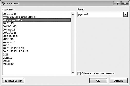 Если установить флажок Обновлять автоматически, то дата и время, вставленные в документ, будут обновляться автоматически, вместе с системной датой компьютера.