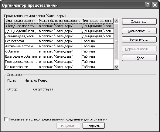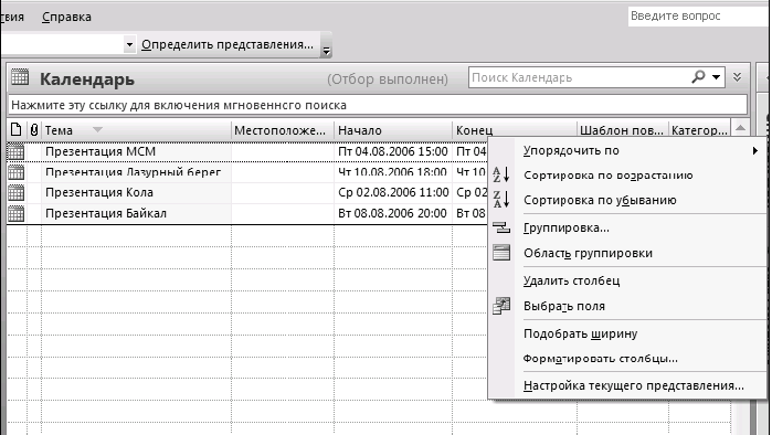 Теперь, чтобы отобрать все встречи, являющиеся презентациями и требующие специальной подготовки, в меню «Текущее представление» на панели инструментов вместо стандартного представления «День/неделя/месяц» выберите настроенное нами представление «Подготовка презентаций».