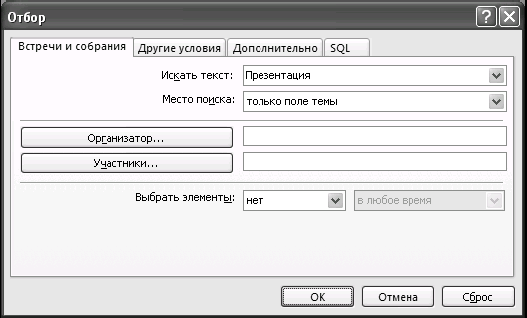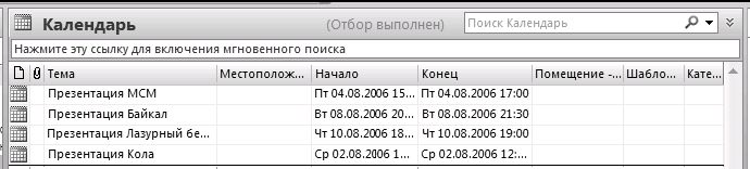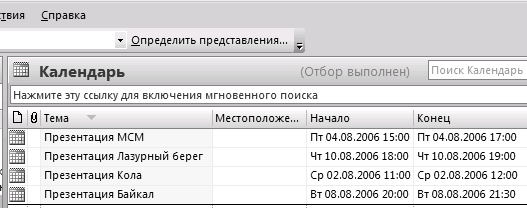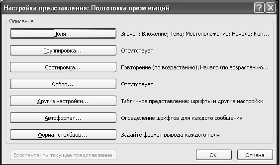 Чтобы настроить табличное представление, нужно знать, по какому признаку Outlook отберет в него интересующие вас сейчас встречи. Например, по синей метке «жесткое планирование» или по слову «тренинг» в поле «Тема». Будем считать, что ваши мероприятия, требующие подготовки, относятся к какому-то определенному типу (тренинг, командировка, выставка) и это слово обязательно присутствует в названии встречи. Разберем настройки на примере подготовки презентации.