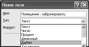 3. Появится окно «Новое поле». Введите имя: «Помещение – забронировать». Тип поля («да/нет») выберите из выпадающего списка. Формат поля оставьте предложенный по умолчанию – «значок». Нажмите «ОК».