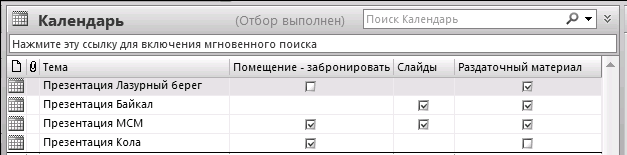 Теперь, чтобы обозначить, что по какой-либо из презентаций забронировано помещение, достаточно кликнуть в окошке на пересечении столбца «Помещение – забронировать» и строки с названием соответствующей презентации. Появится галочка, обозначающая, что данный вопрос по этой встрече уже закрыт.