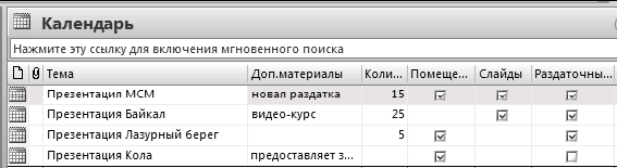 Теперь вы можете напротив каждой презентации в столбце с заголовком «Доп. материалы» вписать дополнительные раз-датки, слайды, отчеты и т.п., которые нужно подготовить к презентации, например: «Нужны образцы полиграфической продукции с нашим дизайном».