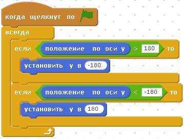 Добавьте Гиге в программу следующий скрипт. В нём использованы овальные блоки положения по оси Y и зелёный оператор сравнения. Как работает этот скрипт, вы уже знаете.