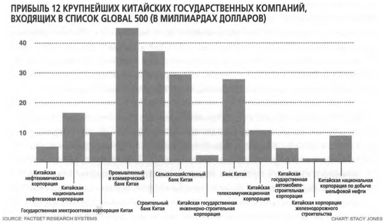 Ответ на этот вопрос состоит в следующем. Мы увидим некую имитацию опыта Китая в Европе и Америке, но процесс будет протекать совсем иначе. Во-первых, в случае Китая речь идет о более молодой экономике страны, которая стремится стать ведущей державой, однако большинство крупных китайских компаний принадлежит государству. Все 12 крупнейших китайских компаний государственные, в том числе самые большие банки, такие как ICBI, Банк Китая, Сельскохозяйственный банк Китая и Строительный банк Китая.