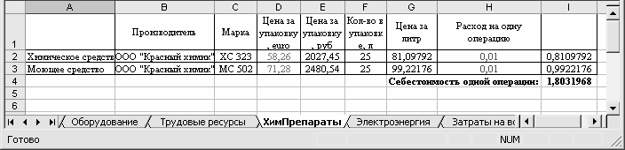 Стоимость израсходованного на одну операцию препарата Химическое средство рассчитывается по формуле = H2*G2, и препарата Моющее средство – по формуле =H3*G3.