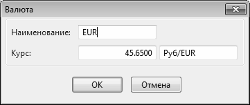 В данном окне в поле Наименование вводится наименование новой валюты, а в поле Курс – ее курс, который указывается в формате рубль/валюта.