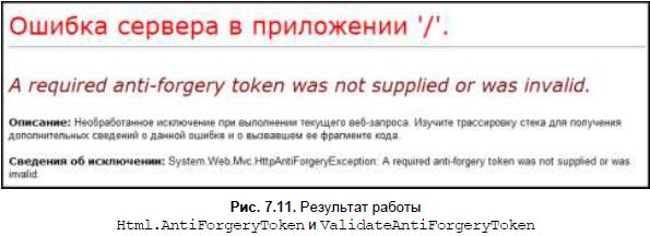 Теперь любой POST-запрос к действию ChangePassword приведет к сопоставлению скрытого параметра формы с внутренним, сформированным на сервере. В случае, если параметры не совпадают, возникнет исключение, которое предотвратит несанкционированный доступ (рис. 7.11). Таким образом, проделав несложные действия, вы надежно защитите себя от CSRF-атак.
