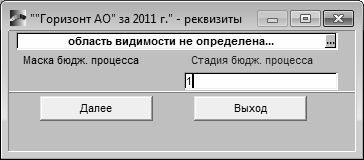 Здесь можно указать область видимости и определить номер стадии бюджетного процесса. Область видимости выбирается из соответствующего справочника – для этого нажмите F3, выделите щелчком мыши требуемую позицию и нажмите Enter. Что касается параметра Стадия бюджетного процесса, то он заполняется с клавиатуры.