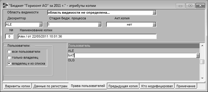 • только владелец – при выборе этого значения с бюджетной копией разрешается работать только создавшему ее пользователю;
