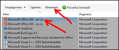 Если ваш пакет Майкрософт Офис работает с ошибками, и он не был установлен одновременно с предыдущей версией Офиса, я рекомендую перейти на панель управления ? «Программы и компоненты»; там выбрать Майкрософт Офис в списке и нажать кнопку «Изменить»: