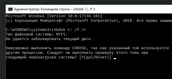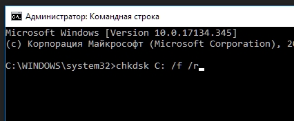 В окне командной строки наберите команду "chkdsk C: /f /r" (без кавычек) и нажмите клавишу Enter: