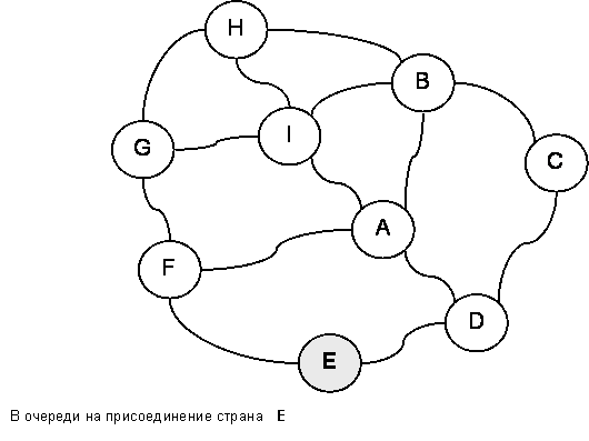 Откуда начать строительство? Пусть центром империи будет страна «E». Окрасим её серым цветом и поставим в очередь на присоединение. Можно сказать, что страна «E» – первый кандидат на включение в несуществующую пока империю.