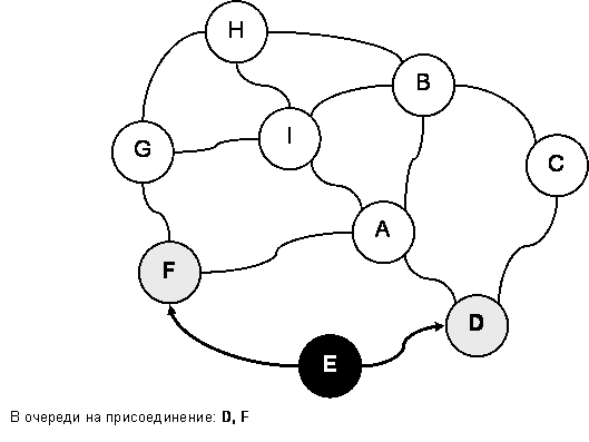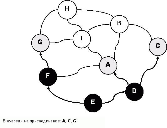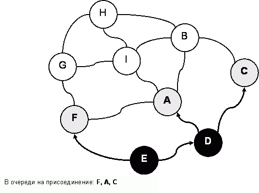 Итак, страна «E» вошла в империю, а два её соседа – «D» и «F» – стали в очередь на присоединение (в каком именно порядке – «D», затем «F» или наоборот – неважно). От них требуют то же самое – уговорить своих белых соседей. Так, для присоединения страны «D» ей надо убедить стать в очередь страны «A» и «C». По мере выполнения этого условия страны-кандидаты чернеют и удаляются из очереди. После двух следующих присоединений (стран «D» и «F») граф и очередь изменятся так, как показано на рис. 141 и рис. 142. Здесь же стрелками показано и воображаемое продвижение купцов.