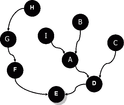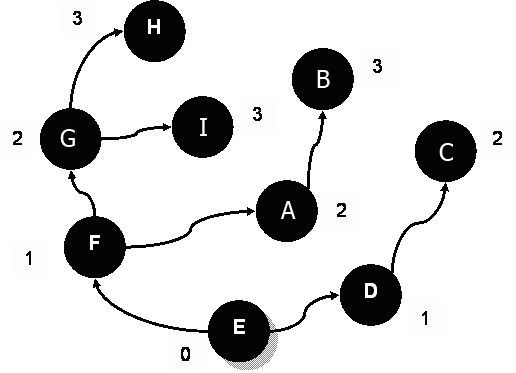 Эти строки напечатаны операторами трассировки в процедуре Expand. Согласно первой строке из узла «E» мы попадаем в узлы «F» и «D». Согласно второй – из узла «F» движемся в узлы «G» и «A», и так далее. Последние четыре строки показывают, что узлы «C», «I», «H» и «B» оказались на окраинах империи, и продвижений оттуда нет. По этой трассировке нетрудно нарисовать дерево воображаемого продвижения купцов (рис. 145).