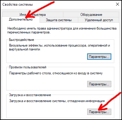Выберите вкладку «Дополнительно» и нажмите «Параметры» в разделе «Загрузка и восстановление»: