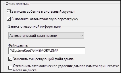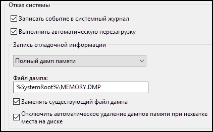 В открывшемся диалоговом окне убедитесь в наличии следующих настроек (или похожих) в разделе «Отказ системы»: